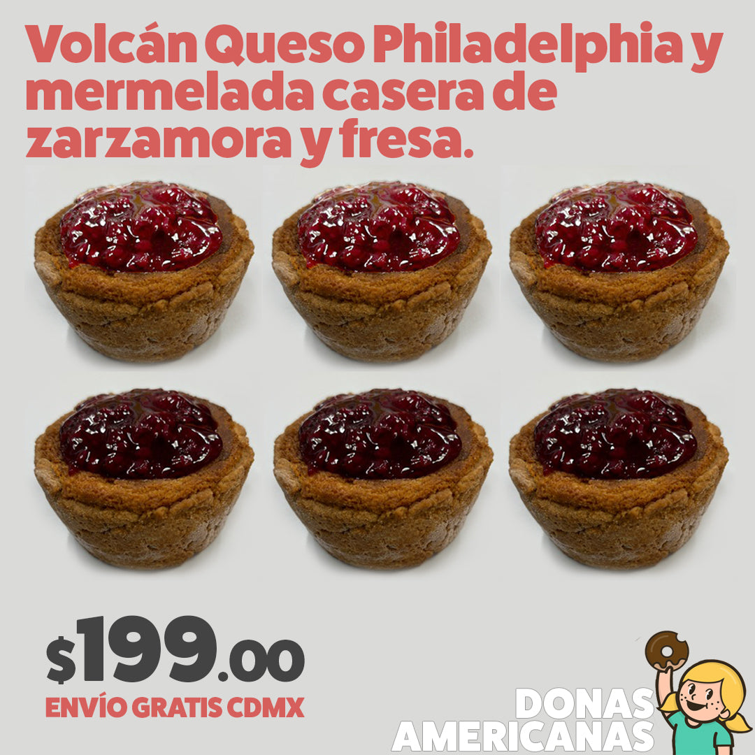 Seis Ricos Volcanes de Queso Philadelphia, 3 con Mermelada de Fresa y 3 con Mermelada de Zarzamora. ¡Ideales para compartir!