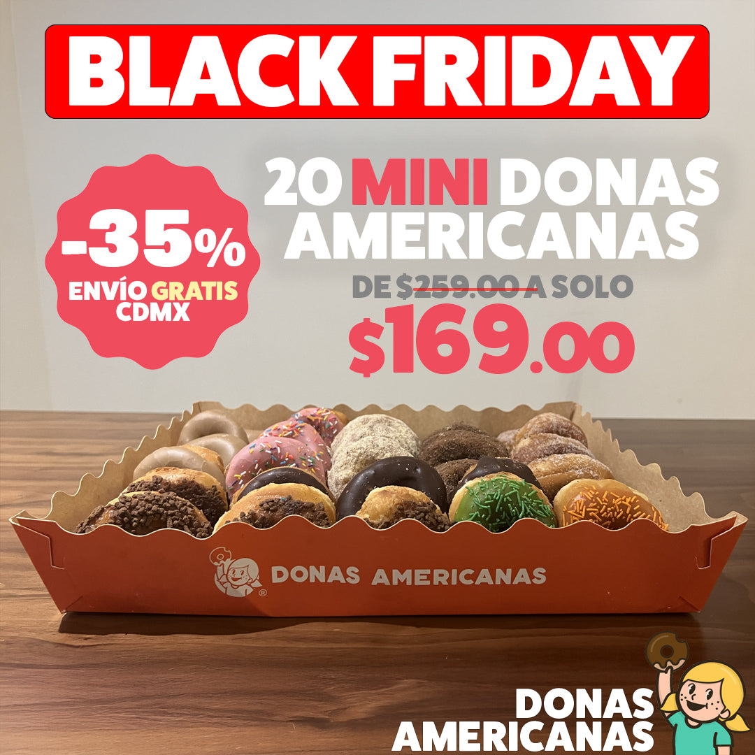 ¡20 mini Donas Americanas Tus Favoritas! Compartarte con tus amigos, familia, colegas, clientes, compañeros, compartelas con todos directo a tu puerta. Las mini donas tienen un diametro de 7cm de puro sabor.